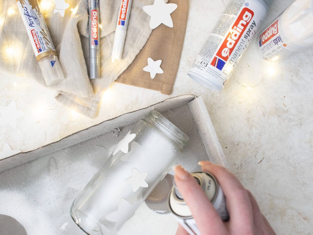 Diese Weihnachtsgläser sind mit den vielseitigen Produkten von edding entstanden – darunter das Permanentspray, die Glanzlackmarker und der 3D Double Liner. Die Produkte harmonieren perfekt miteinander und lassen sich wunderbar kombinieren. Mit ihnen kannst du deiner Kreativität freien Lauf lassen und meine Weihnachtsgläser ganz einfach nachmachen. Zudem kannst du so die besinnliche Weihnachtsstimmung sicher noch intensiver genießen. 😉