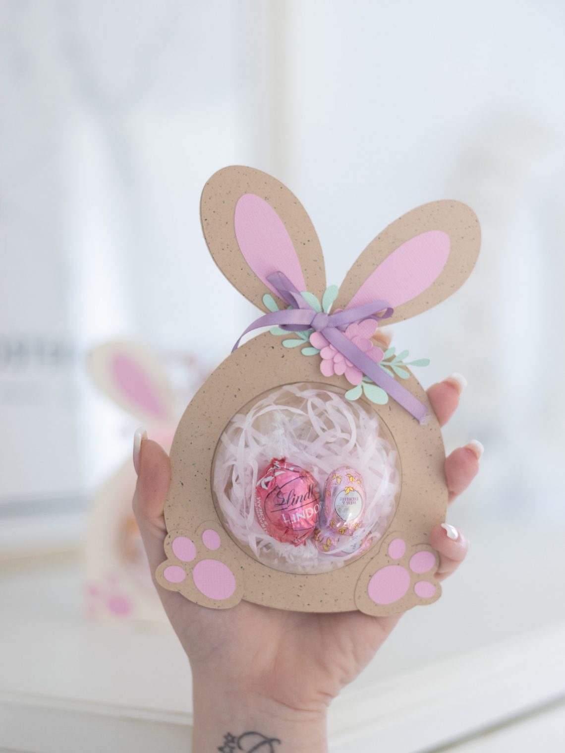 Die Öffnung in der Vorderseite ist für eine klare Plastikhalbkugel gedacht. Lege diese in das Loch ein und befülle sie nach Lust und Laune mit kleinen Süßigkeiten, Ostergras oder anderen Überraschungen.